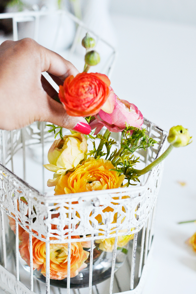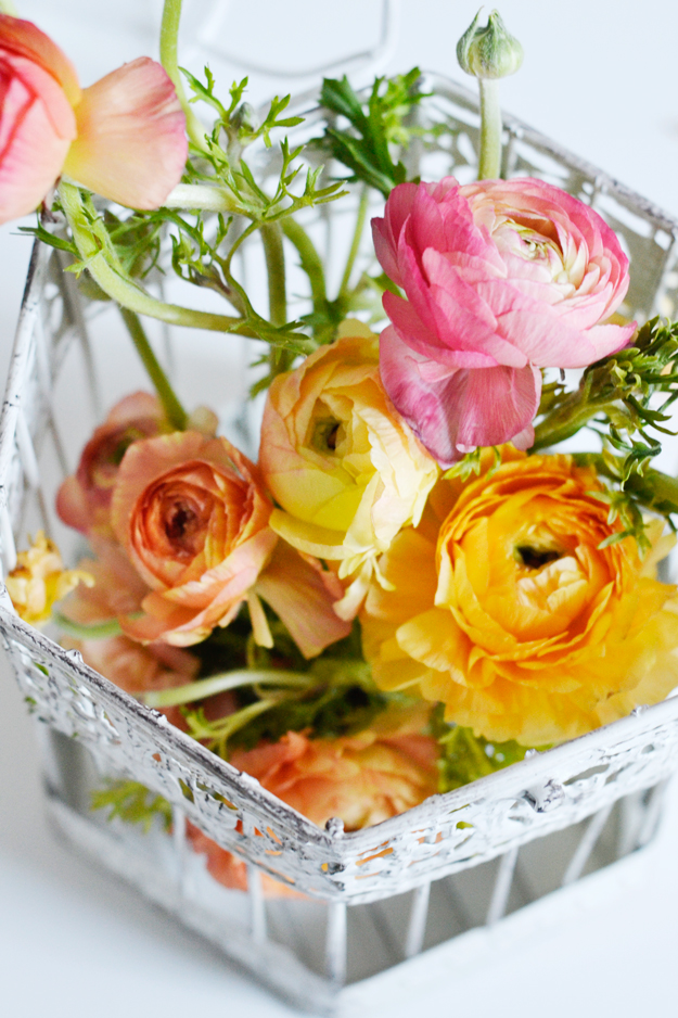 Today I’m going to share a simple flower DIY I did for Casa and Company a couple of weeks ago. I used a beautiful bouquet of ranunculus. I picked up a $5 bouquet from Trader Joe’s and a decorative birdcage on sale at Michaels. Total cost was under $20!