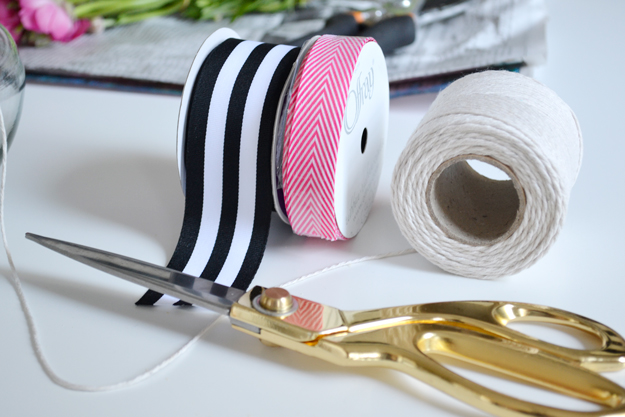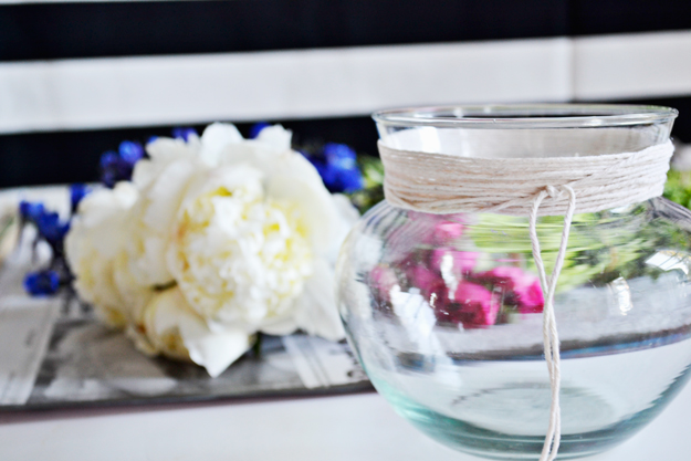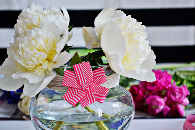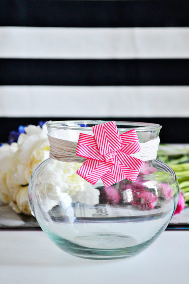 First prep the vase with a quick and easy DIY. Using the twine or rope, cover the rim of the vase. Wrap the twine around as many times as wanted and tie in a knot to secure. Then select a striped ribbon to create a small flower accent. Fold the ribbon back and forth, rotating each time, to create a flower/star shape. Use the glue gun to secure each fold with just a little dab of hot glue. Once dry, glue the flower onto the twine border. Be careful not to glue onto the actual vase.