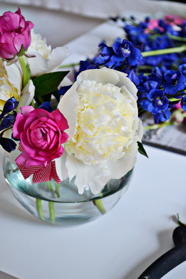 Hey folks! Today I’m sharing a DIY that’s perfect for summer entertaining. I love creating unique flower decor and this one is inspired by preppy nautical style. This nautical themed centerpiece is also a little twist on the traditional red, white and blue for July 4th! It’s a really simple arrangement and you can choose any type of flower you wish to recreate the look. I originally shared this DIY on Casa & Company and now I’m happy to share it with all of you!