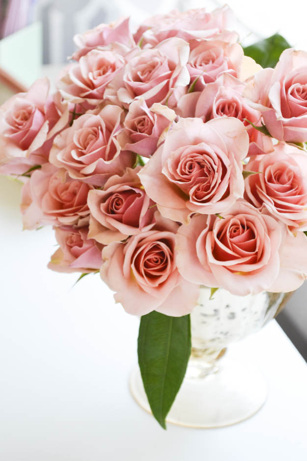One of my favorite budget bouquets for under $10 are spray roses. This smaller variety of rose grows in clusters from one stem. This pink arrangement of my desk was just five stems of the flower. I always find these at my local grocery store in a variety of colors.