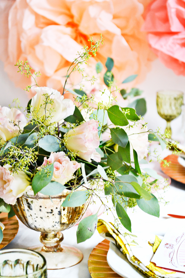 This arrangement for a bridal shower photoshoot used mostly greenery. Greenery is always an inexpensive option for any arrangement. It looks quite beautiful on its own or with a few stems of a flower like lisianthus.
