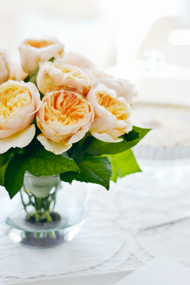 I find that keeping an arrangement monochromatic can have a large impact on a table, nightstand or desk. This arrangement of a dozen peach garden roses was held together using a metal flower frog. You can find these at your local craft store for just a few dollars. It’s perfect for keeping blooms upright and tight together.