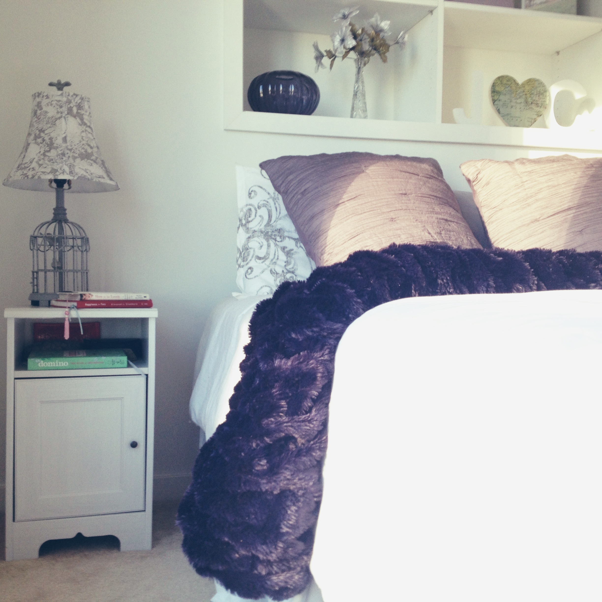 Choosing purple for our color scheme was so easy! We wanted a peaceful yet regal color. Our bedding is a lovely off-purple, in between mauve and lavender, yet our throw is a deep and rich aubergine. It’s such a soothing atmosphere especially when sunlight bursts through our high windows.