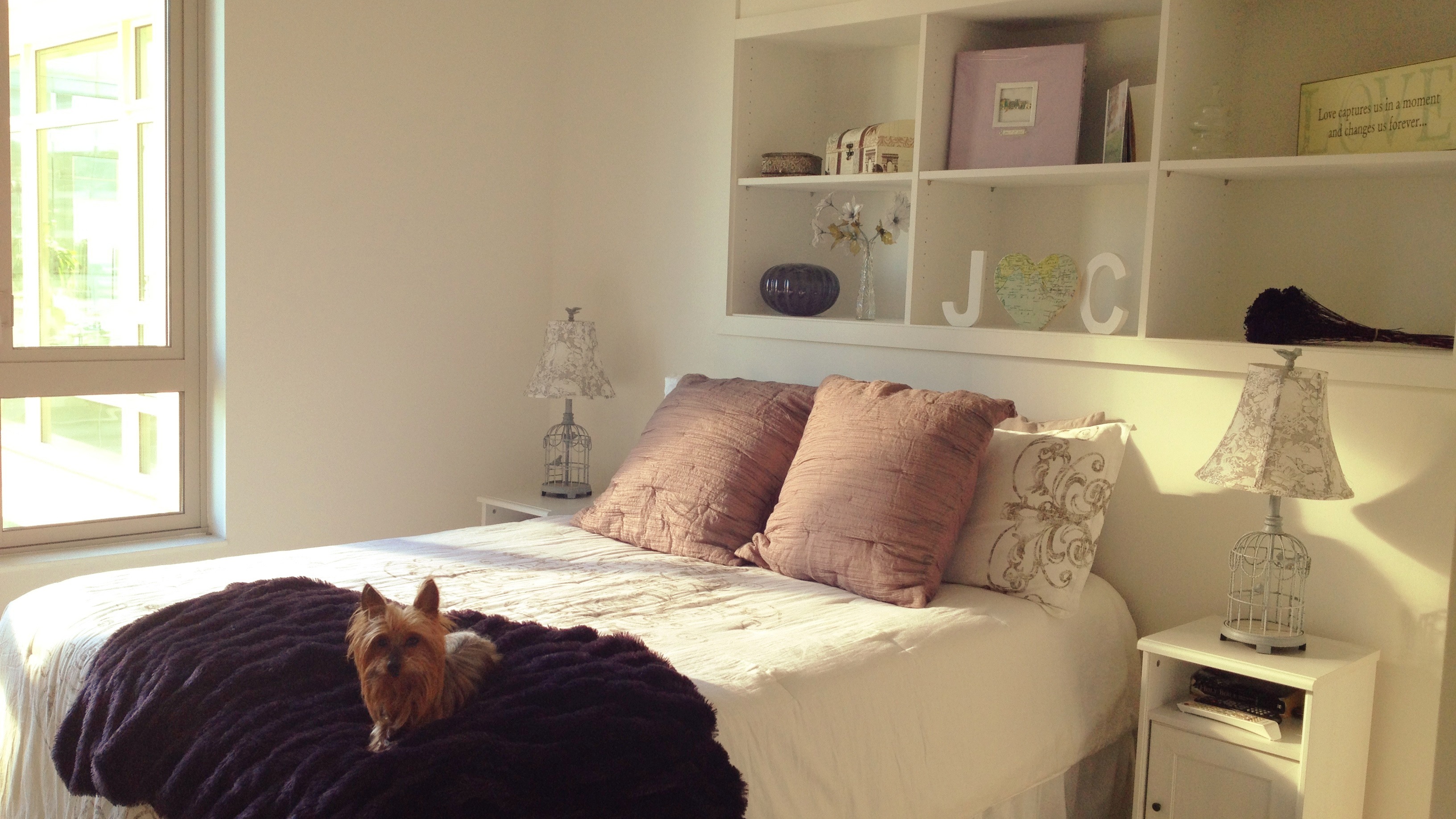 And look who snuck into the photo-shoot! She truly is the little queen of this bed and the faux fur throw is her favorite spot.