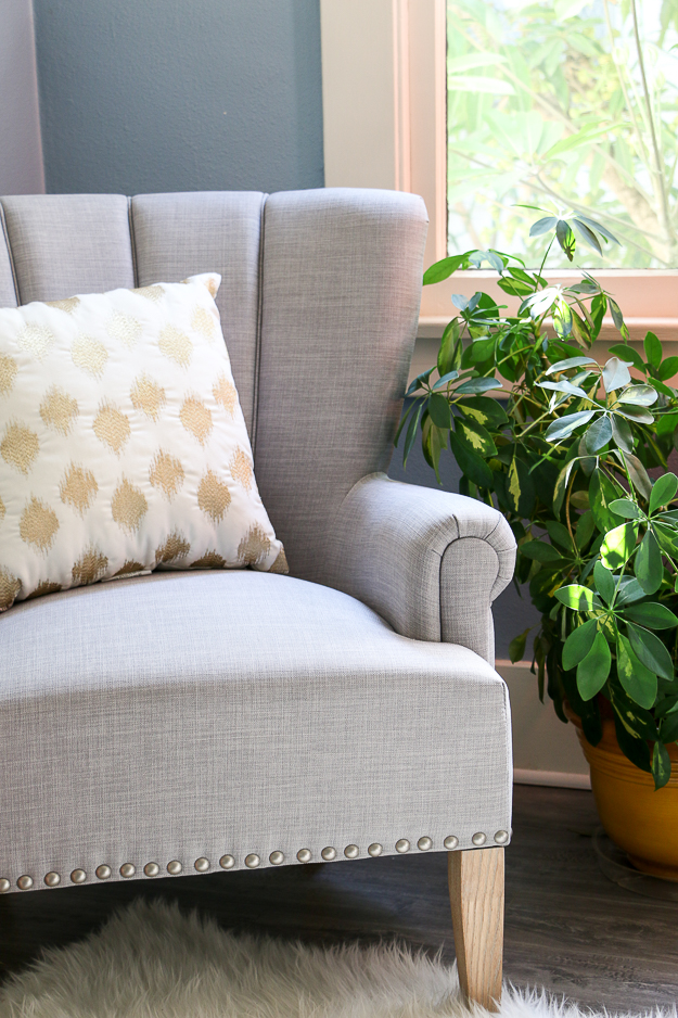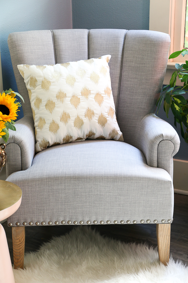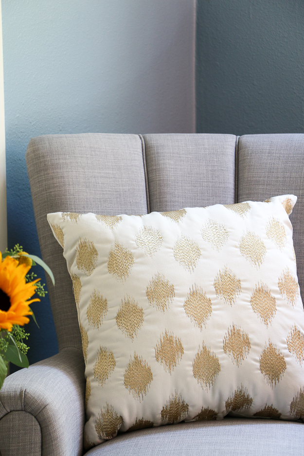 I love the gold pillows in the Better Homes & Gardens collection, like this gold metallic pillow. We also have the heart gold foil pillow in our living room reading chair, so each corner compliments each other. It’s a cozy chair, but still firm enough to sit up and have a proper conversation.