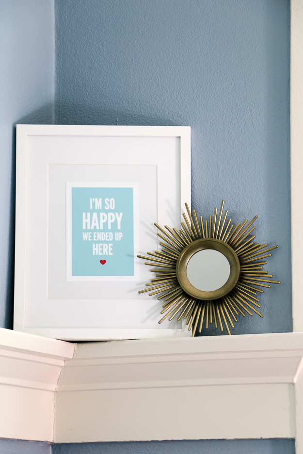 The lounge completely faces away from the distracting TV and we have a nice bluetooth speaker to enjoy music. Plus there’s the huge window that brings in tons of natural light and a nice view of our neighbors trees. I added one of our gold mirrors and an art print framed in the white picture frame.