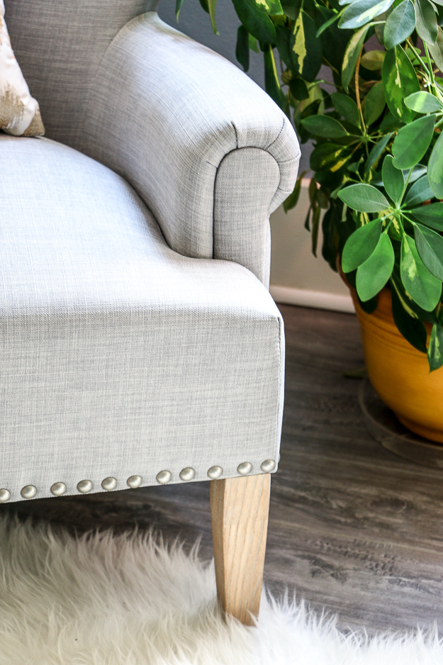 We started by adding the accent chair. Our grey floors are one of our favorite things about this apartment and I love adding grey accents in our decor. My husband loves wingback chairs and this modern version with a touch of farmhouse chic is perfect. He will enjoy many a glass of bourbon sitting here!