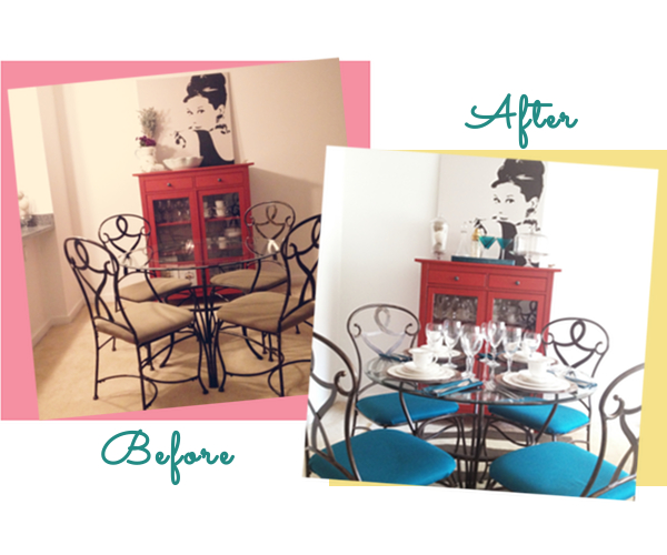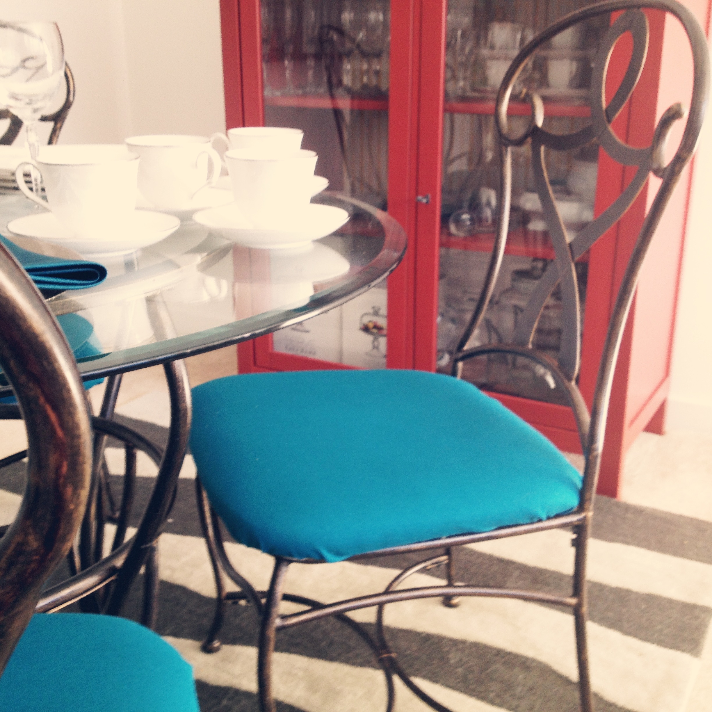The dining chairs are done! I have to admit that I handed off the task to my husband this weekend, but I did measure and cut everything for him. It’s a dramatic difference in our dining area and really the whole apartment. We needed contrast, badly, and the peacock blue was the perfect solution!