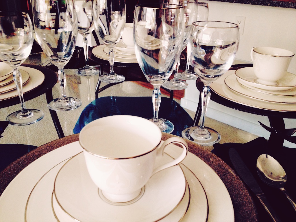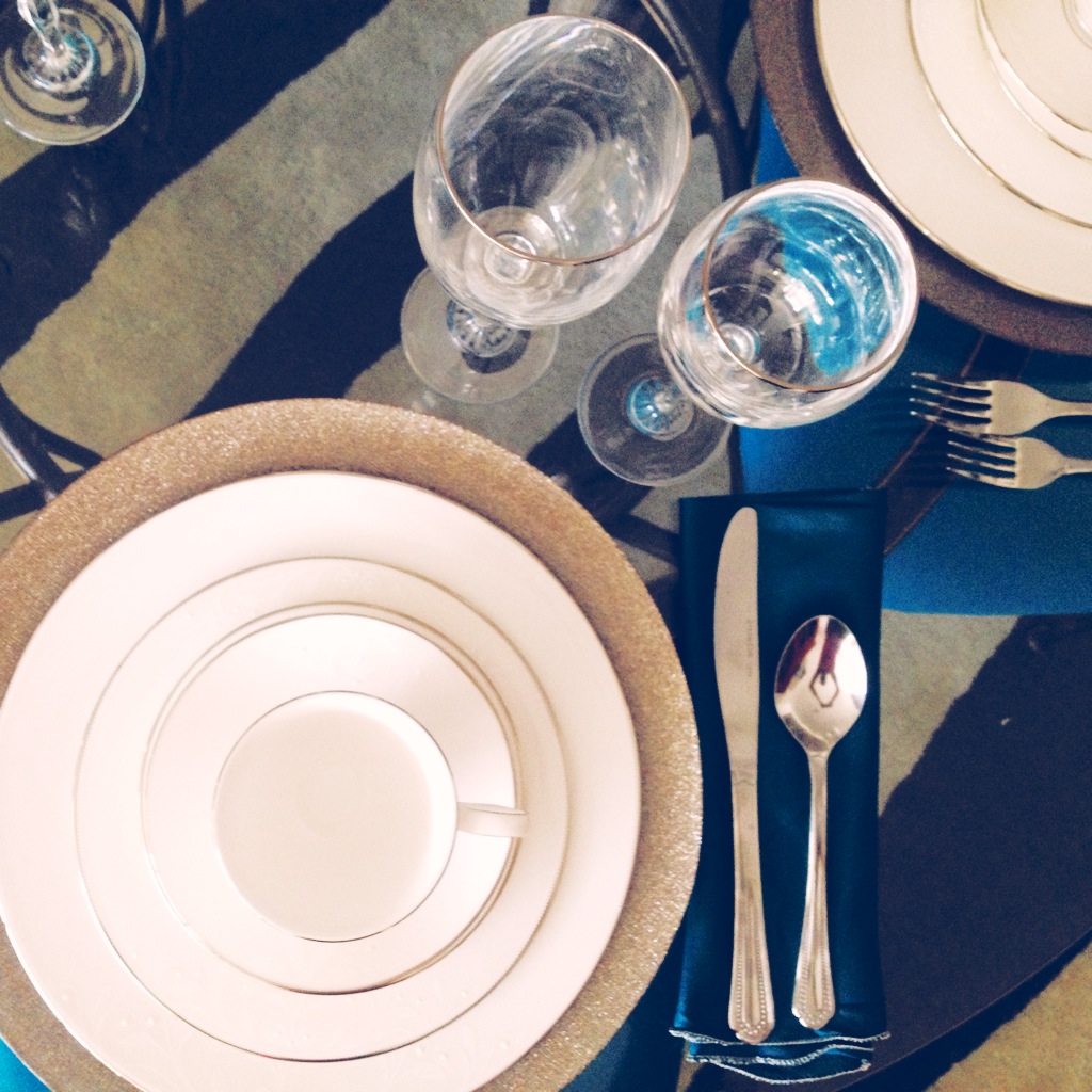 In addition to the peacock blue makeover, we moved our striped rug to dining room to give it more of a glamorous feel. Our champagne glitter chargers and classic china collection makes the space sparkle. And I can’t forget the true inspiration behind our glamour inspired decor, Audrey Hepburn as Holly Golightly canvas!