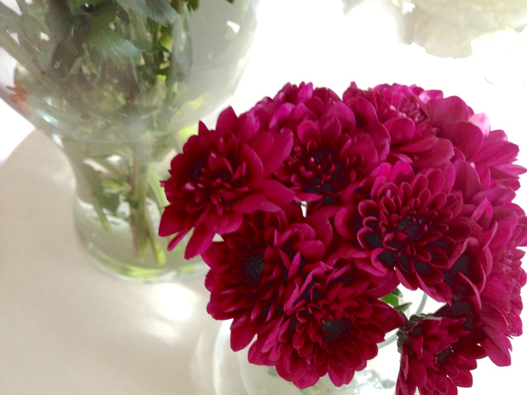 As I promised yesterday, I went to my local flower market and purchased a beautiful bunch of white hydrangeas and plum poms. I was so excited to peel off the newspaper and get started making a couple arrangements for our apartment.