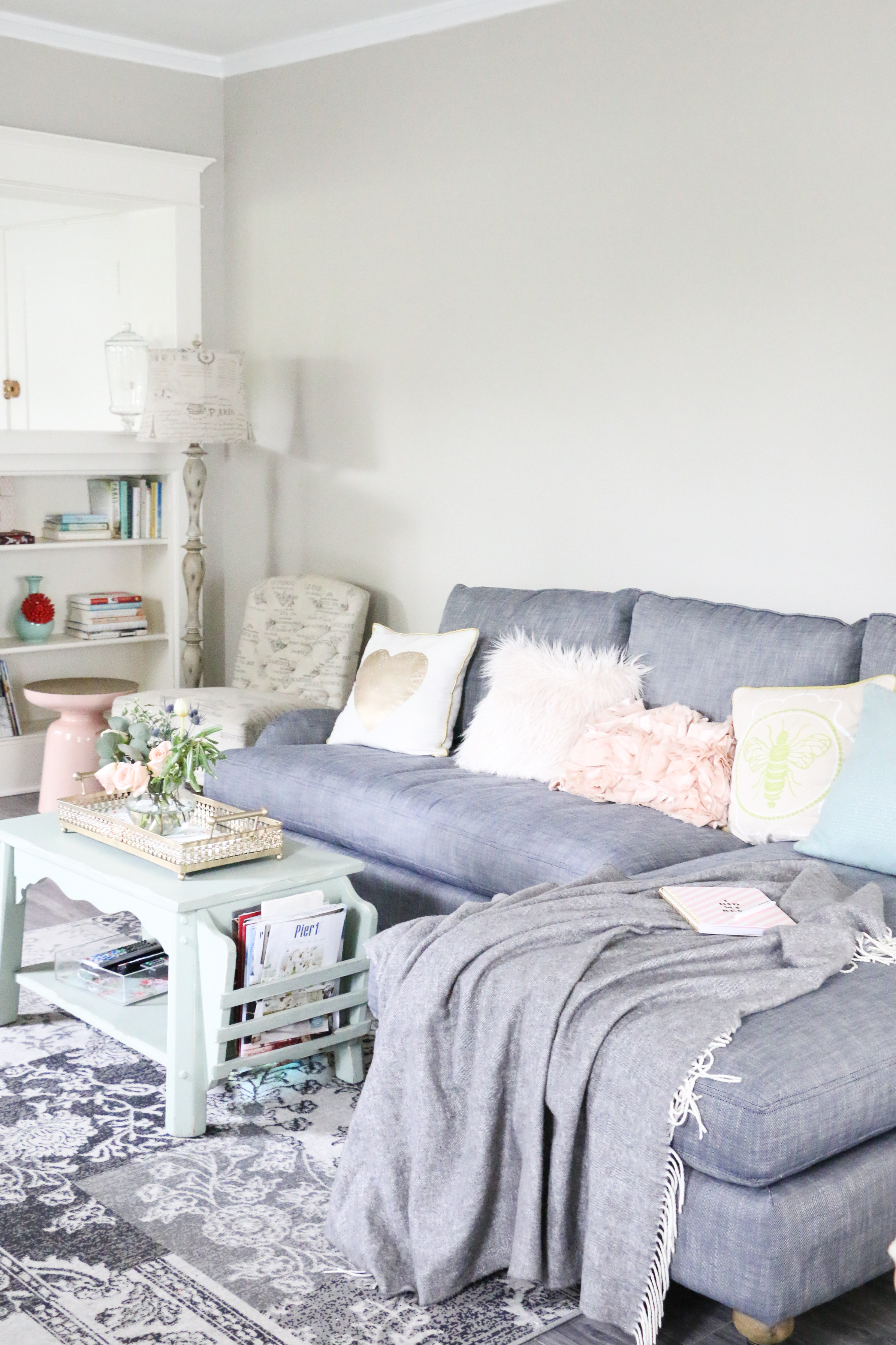 So then we headed over to our local Restoration Hardware outlet (definitely a plus to living in Long Beach!). I found a ton of pretty chairs, linens, rugs and then spotted this sofa. We passed by it a few times before we tested it’s comfort level. It was perfect. Right size, chaise was on the correct side and I loved the English rolled arms. Many of the sofas I pinned over the past few weeks had rolled arms (they are shorter and more elegant). We put the sofa on hold and debated for some time if we should make the investment. I also could not figure out the color. From some angles it looks grey other blue. Technically it is a perennial navy textured weave, which makes it great for parties (aka spills). It’s a fabric that can exist indoors or outdoors, but is still for comfortable and soft. We knew whatever sofa we purchased needed to last a few years. This one definitely has longevity. I’d like to move on to other pieces in our home (like the dining room, yikes) and not have to worry about replacing a sofa in year or two.