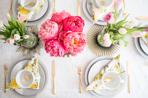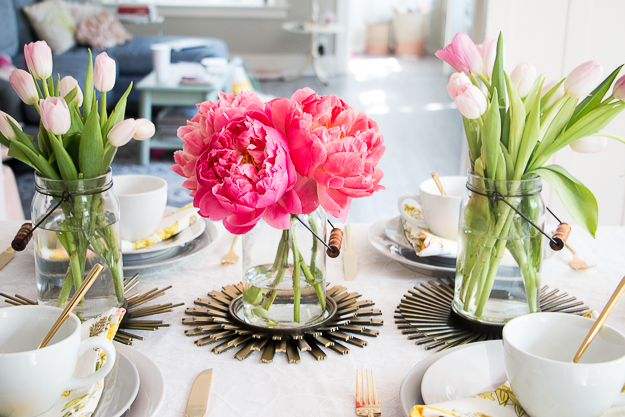 Personally, I think no table is complete without a centerpiece. I collect all sorts of vessels for holding flowers, plants or other decorative accents. For this table, I converted Tealight Holders into vases. I picked up a few peony and tulip bouquets from my local market and simply added them to each jar.