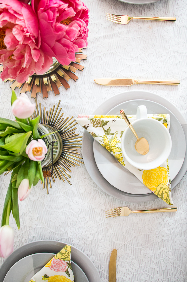 Adding texture to a brunch table can be achieved in many different ways. I like to add a table runner of some sort, whether it’s fabric or in this case, metal. I used a set of Gold Mirrors to place each vase on the table. The mirrors add a little bit of glam style, but it’s still subtle enough to not distract from the other decor elements.
