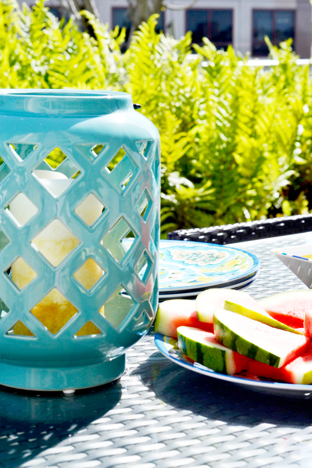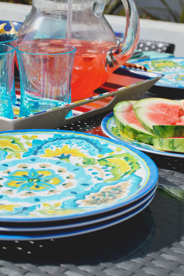 Use plastic instead of glassware. I’m all for really glassware, china and the like. The last thing I want is a strong breeze to come along and knock over my favorite wine glass! I highly recommend using non-fragile plates, glasses, serveware when entertaining outdoors. Someone always drops or knocks over something at every party. I love the aqua watercolor melamine plates as an inexpensive and colorful option for outdoor entertaining. Plastic tumblers are perfect for alcoholic and non-alcoholic beverages. If you’re worried about little ones picking up the wrong glass, give children a different colored glass for the adult guests.