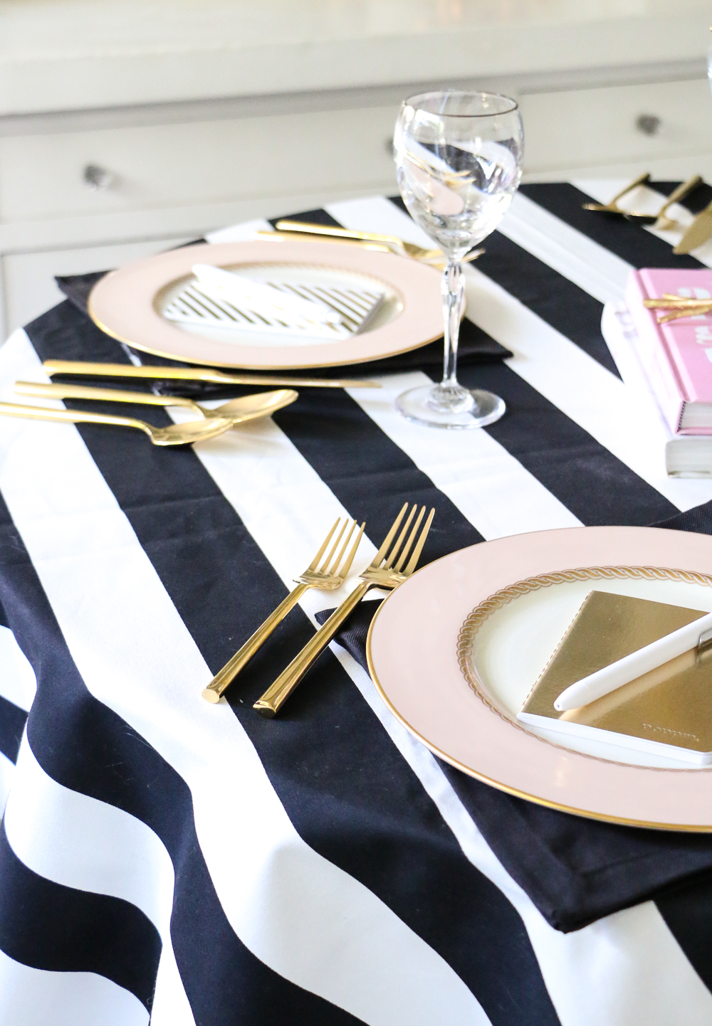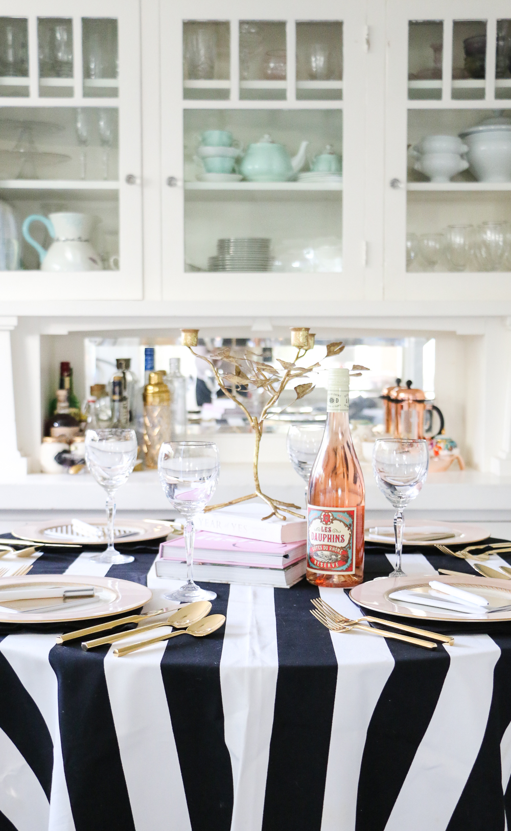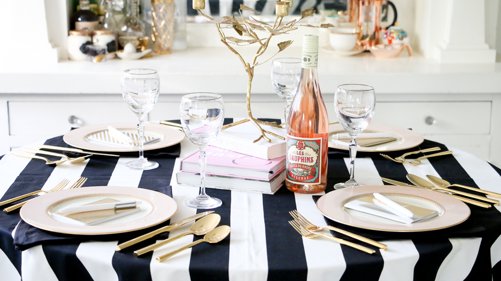 Today’s table is themed around a book club dinner party. There’s flowing wine for friends, great books to discuss and of course pretty decor. A bold black and white tablecloth will spark everyone’s attention, but the soft pink plates offers a calming delicate tone. Little gold notebooks and pens make jotting down great ideas much easier. It’s better then pulling out a cellphone, no phones allowed. Of course gold flatware will jazz up any meal, even if the main course is disguised take-out. Serve a crisp chilled rose’ like the Les Dauphins to please everyone’s wine preferences. Have a few bottles on hand, it’s going to be a long, high-spirited evening. Cin cin!