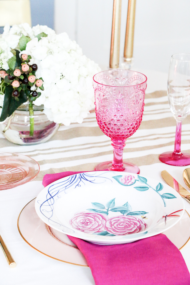 Happy Super Bowl Sunday everyone! I’m here to give you a much needed dose of girly today. Every week I post a new table setting photoshoot inspired by different celebrations and everyday gatherings held at home. Valentine’s Day happens to fall on a Sunday this year, so I thought it would be a perfect theme for this week’s Sunday Table. There’s plenty of pink and flowers in this table setting!