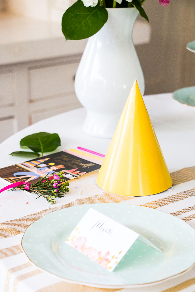 The mood of the table is playful elegance. Very much inspired by my love of the tea party scene from Alice in Wonderland. I used a simplified color palette of mint, pink, white and gold. The polka dot rose tea set is the star of the table setting. A giraffe, hedgehog and mouse are the table hosts and parade proudly down the center of the table. Handwritten calligraphy place cards tell each guest where to sit for tea. A cake stand is ready for a homemade cake and there is a card, a party hat and small bouquet for the birthday girl. It’s an intimate party for just the closest of friends.