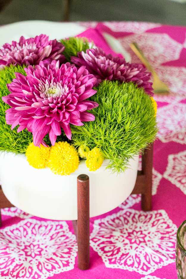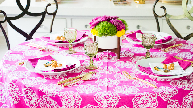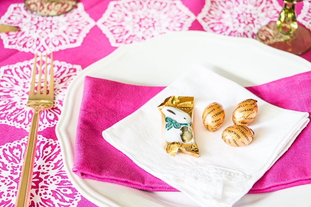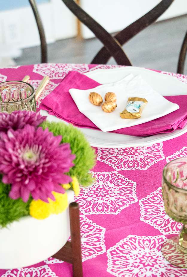 This week I wanted to create a very vibrant Easter table setting. I was inspired by the colors of fresh grass and dyed eggs. I found a beautiful fuchsia pink tablecloth by local designer, Pacific & Rose . Then I found chrysanthemums in the exact same shade for a centerpiece arrangement with green dianthus and yellow button pops. The ceramic vase is by Modernica with a very low profile perfect for a dining table. It doesn’t block the view across the table! I believe in using gold flatware wherever possible and my inexpensive set from Target gets used quite often. I used vintage green goblets as glassware. At each place setting a small assortment of my favorite chocolates from Ghirardelli, a milk chocolate caramel bunny and toffee milk chocolate eggs. It’s a delightful table setting for any age!