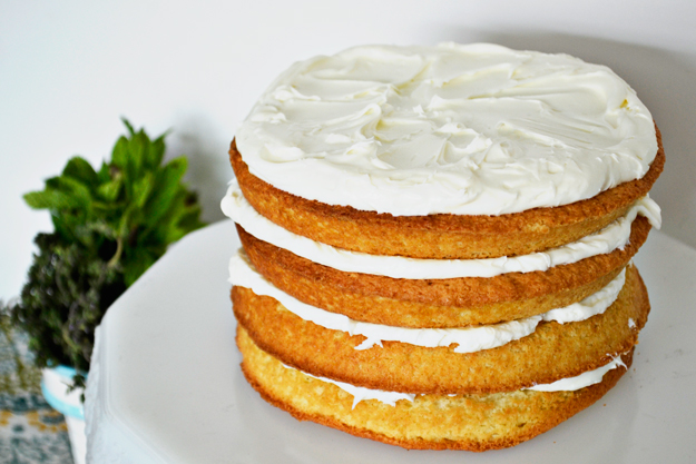 Next spread frosting in between each layer. It helps to turn the bottom two layers upside town. This creates a nice level and flat base for the cake. Use an angled spatula to spread an even layer of frosting between each cake round. Then go ahead and cover the top of the cake with a thick layer of frosting.