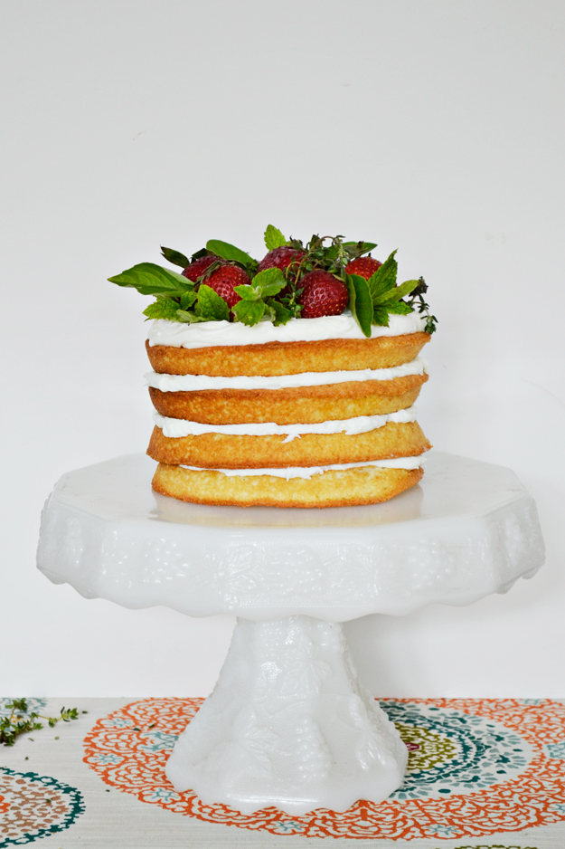 Arrange the fresh strawberries and herbs on top of the cake. Cover the majority of the top with strawberries, leaving small little holes to slip in the leaves and branches of the herbs. There is no right or wrong way, that’s part of the rustic style! Add as many herbs and strawberries that appeals to your eye. Feel free to mix in other fruits, flowers and herbs.