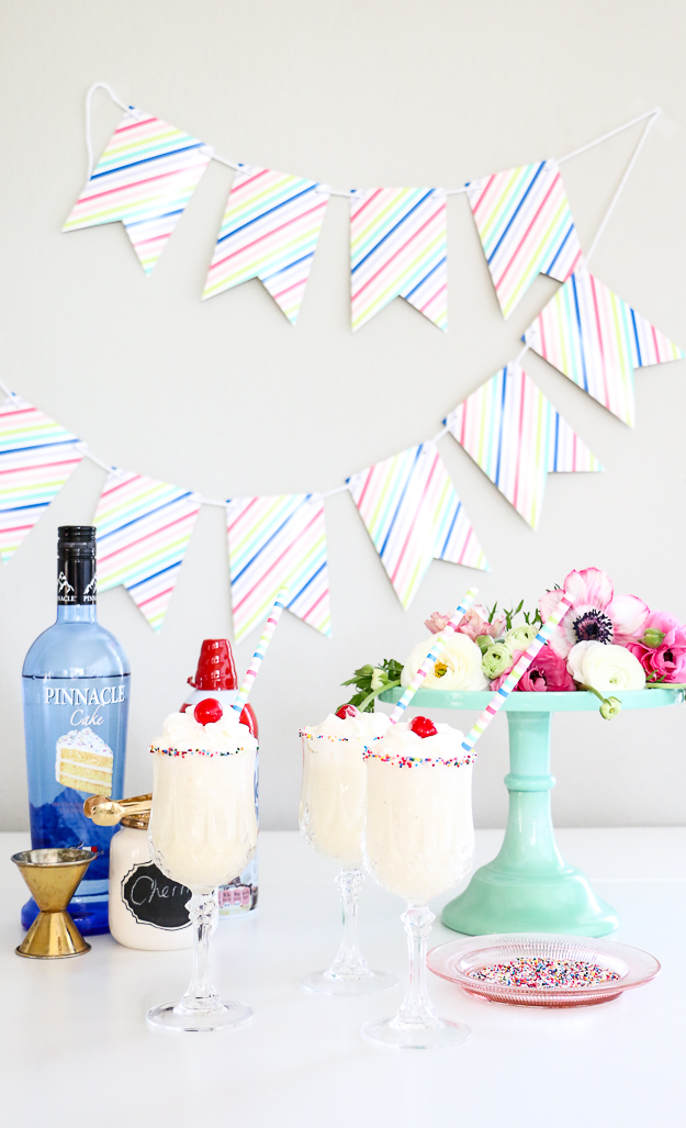 I have a birthday coming and I wanted create a cocktail that any birthday would love to enjoy. I’ve been curious about cake-flavored vodka for a while and I finally picked up a bottle from BevMo. Pinnacle vodka makes a really delicious version, it really does taste like a birthday cake. The recipe simply involves blending cake-flavored vodka with vanilla ice cream. The garnishes are the real stars of this cocktail – colorful sprinkles, whipped cream and a cherry. It’s a very pretty cocktail for any special occasion! The full recipe and my suggestions for making are on Better Homes & Garden’s Delish Dish blog. Cheers!