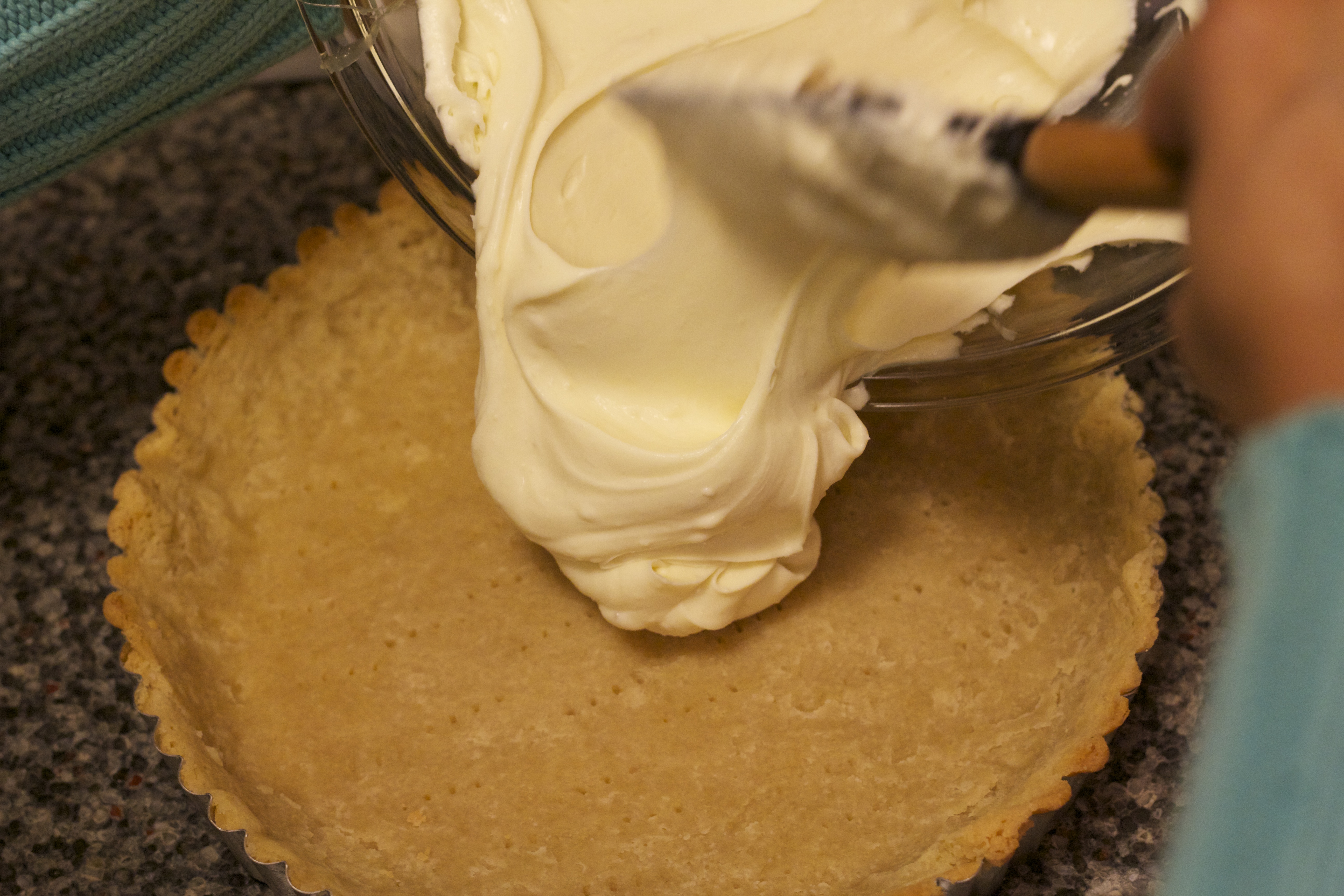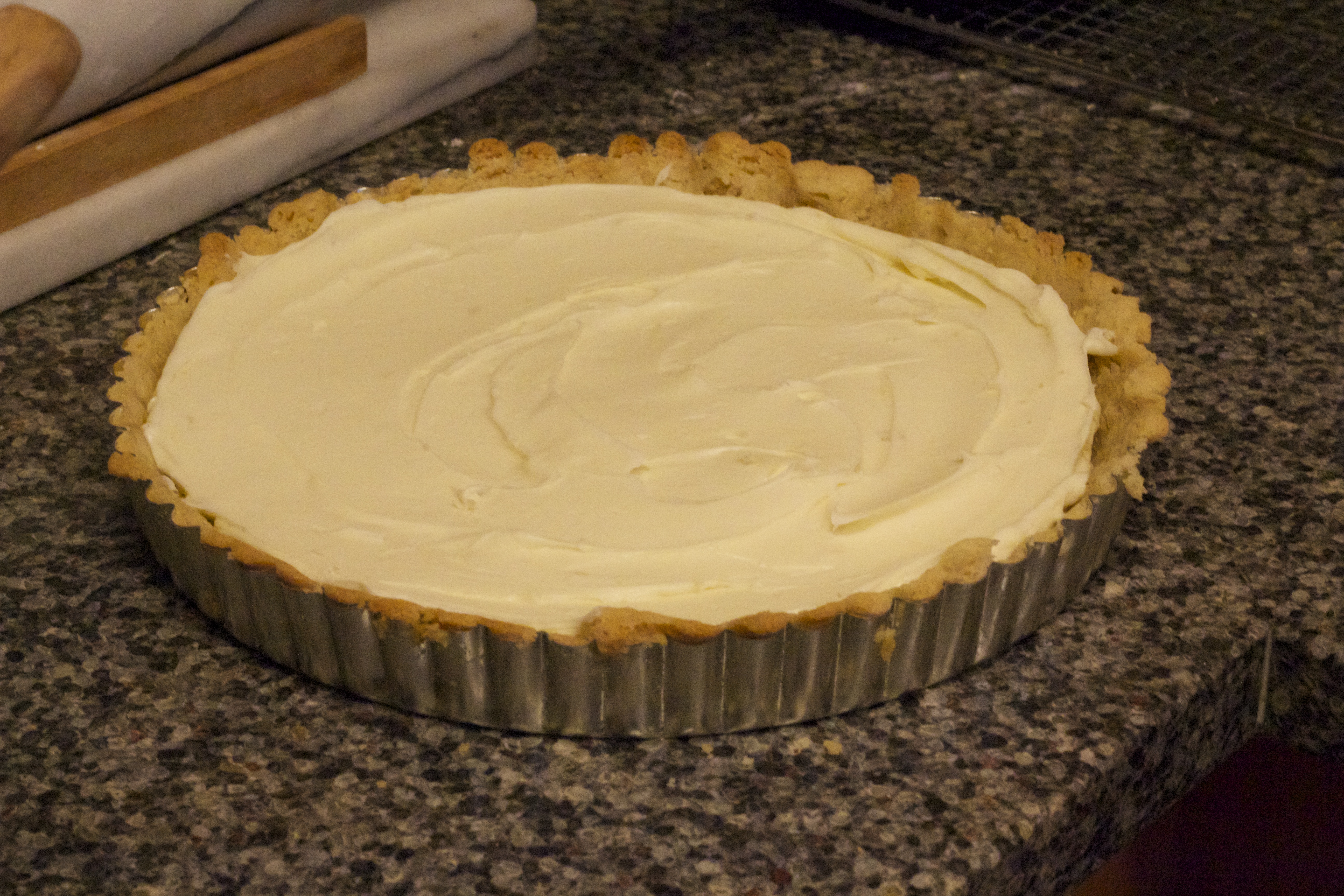 Place mascarpone in a bowl and mix with rubber spatula. Slowly add the the thick sugar/gelatin/cream and mix until blended. Pour filling into cooled tart shell and place in freezer for 20 minutes.