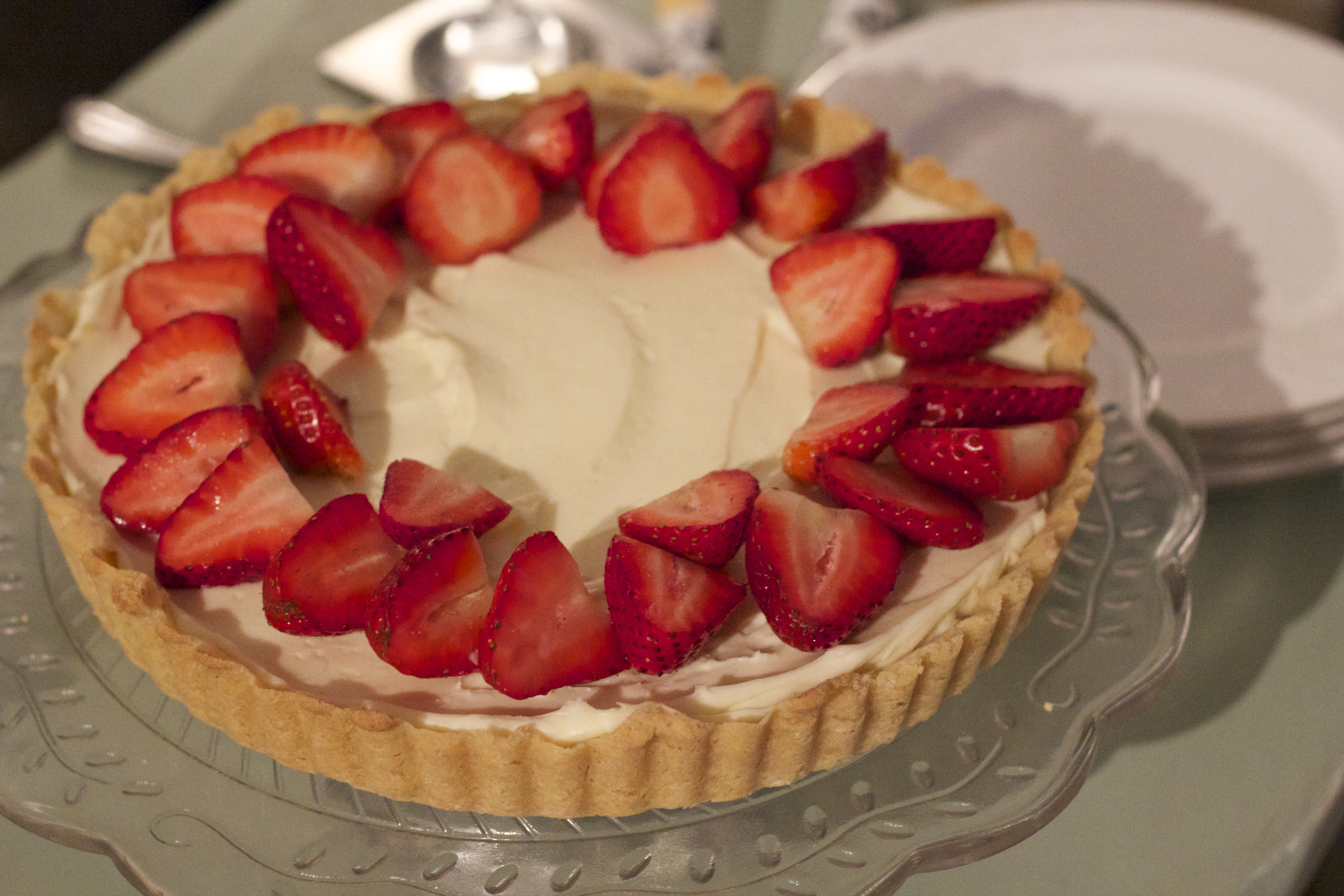 Slice strawberries in half and simply arrange on top of the chilled tart. Voilá, a delicious dessert ready for spring.
