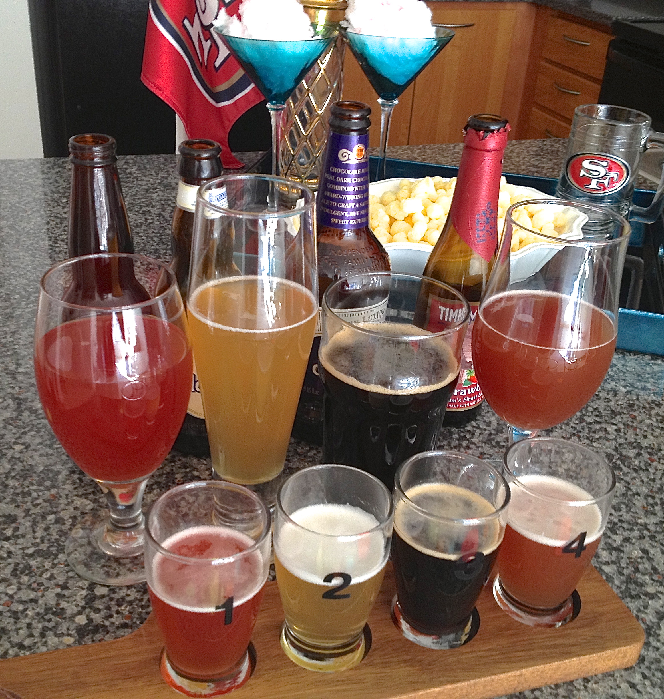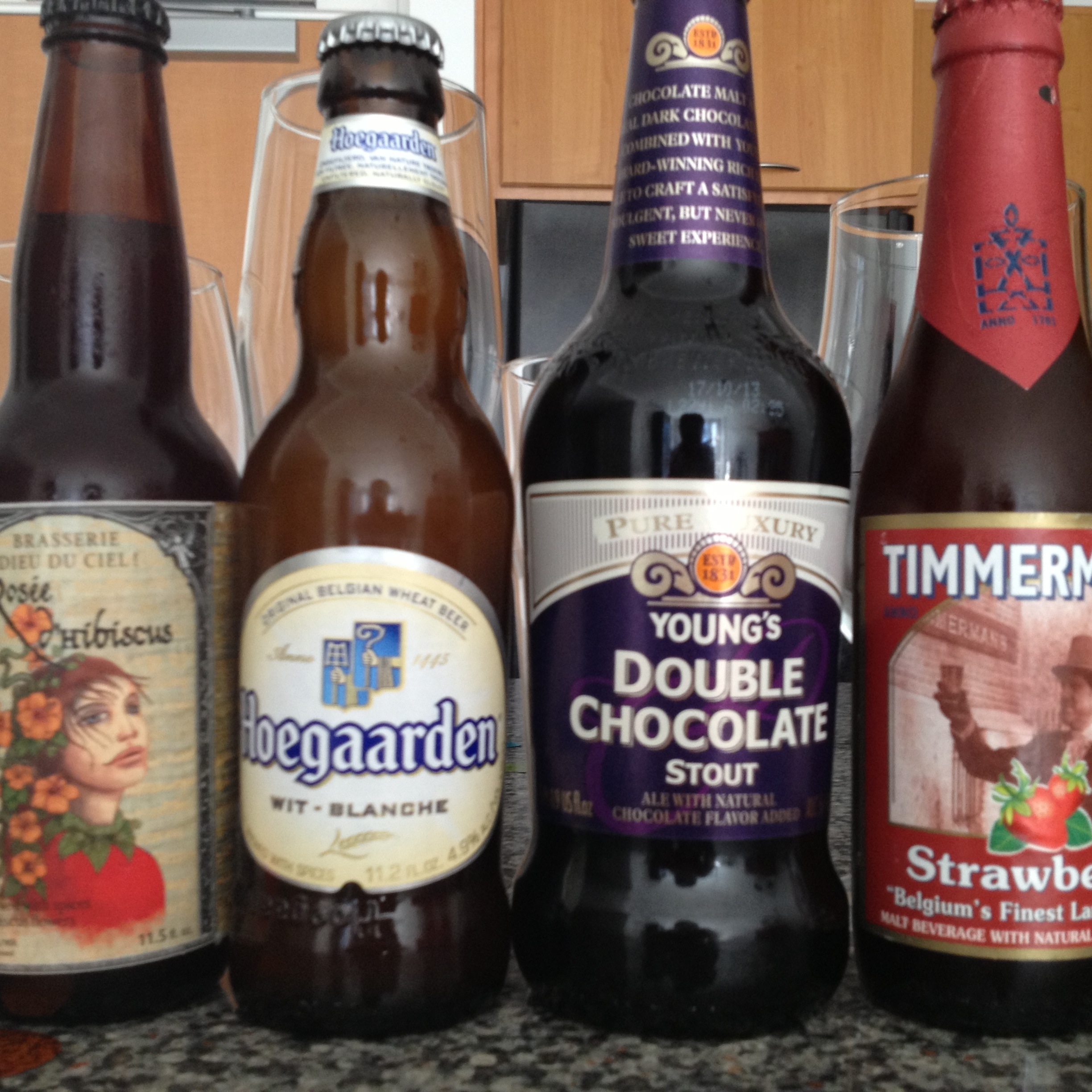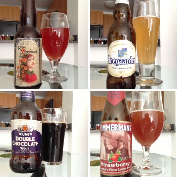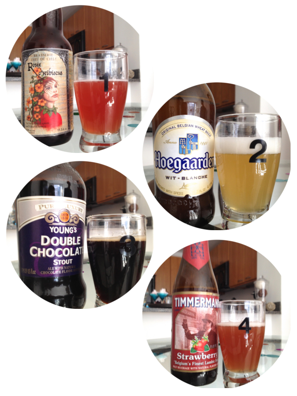 As best you can, different types of beers should be served in a specific glass. The correct glass helps maintain the proper taste and aromas. Libbey makes an amazing assorted set of six glasses ($20). The Rosée d’Hibiscus is best in a goblet, Hoegaarden in a vase, the chocolate stout in a English pint and Timmermans in a tulip as shown above. You can also sample out the beers in these cute little glasses ($30) from Crate & Barrel!