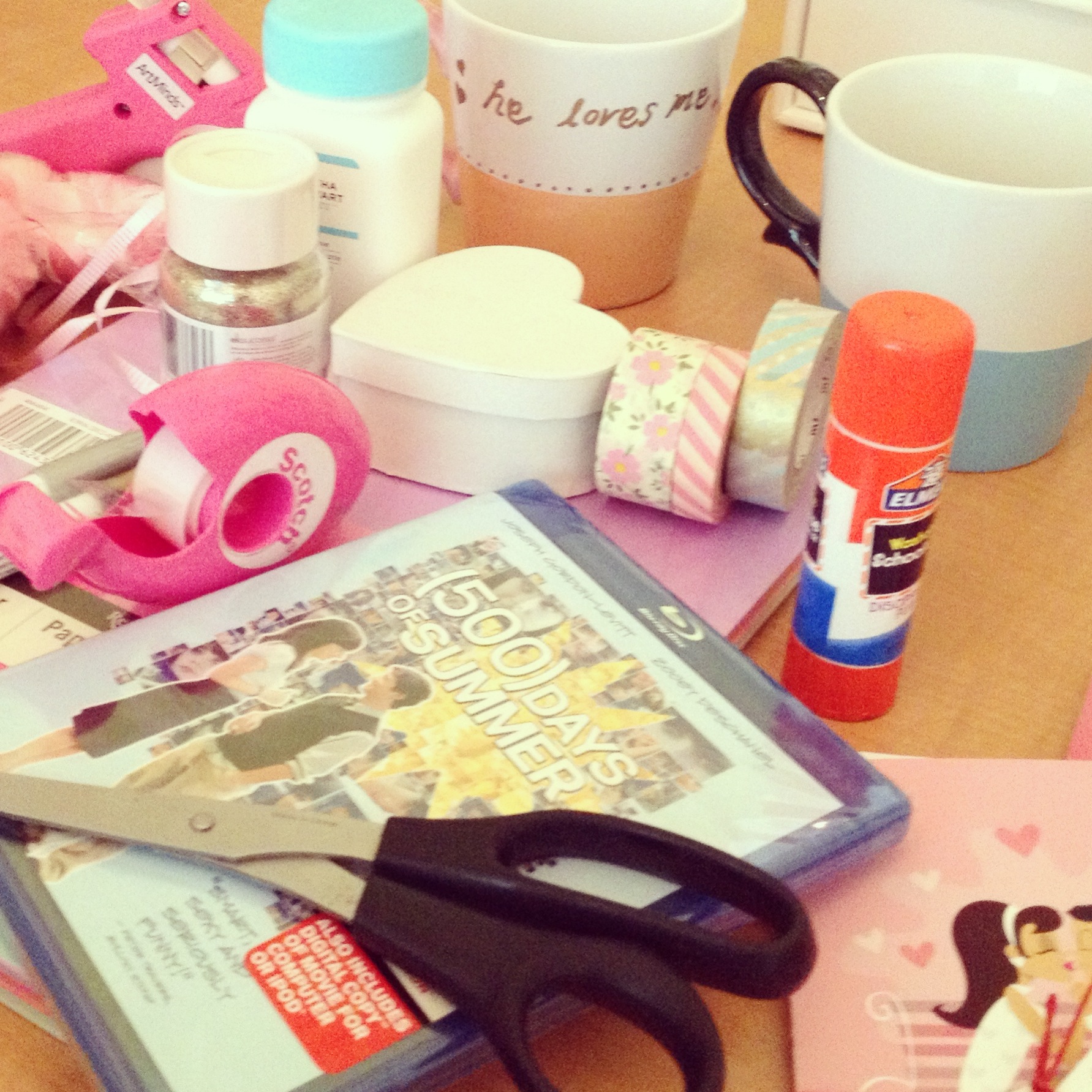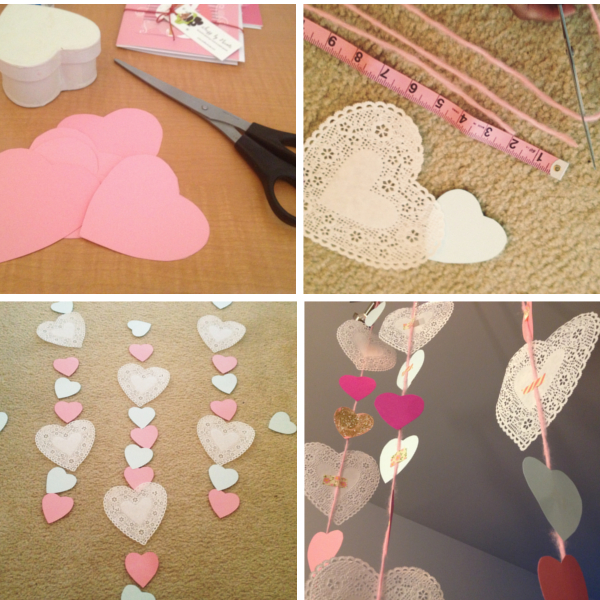And I made a DIY heart garland to hang over the dining table inspired by Oh Happy Day’s post. Of course I added my own flair of lace, washi tape and more glitter!